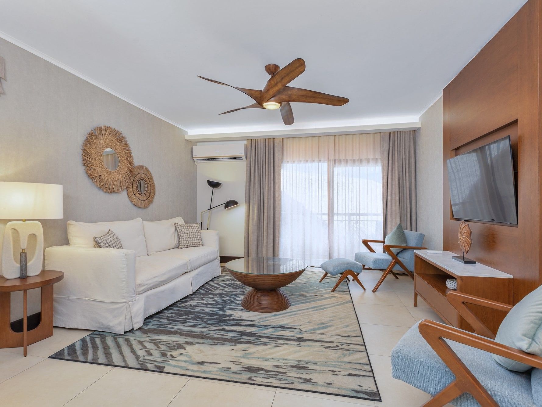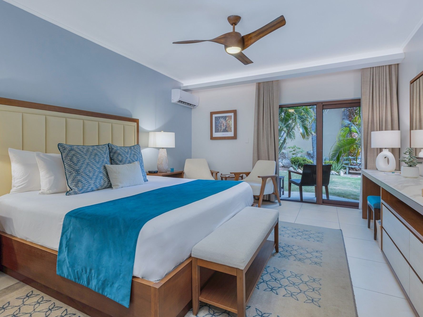 Overlooking beautiful Eagle Beach and the resort’s collection of thatched-roof beach palapas, the newly designed partial Deluxe Ocean View Rooms offer a sense of modern luxury with classic furnishings, soft textures and aqua colors.